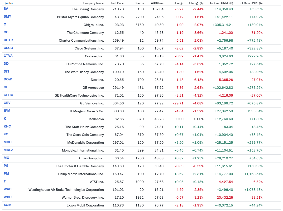 以下は2025年10月10日米国市場閉場後の自分が所有している銘柄のデータ。