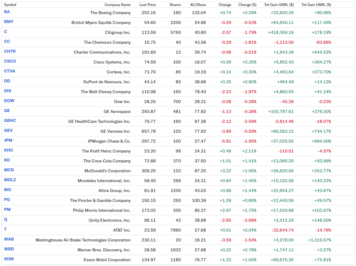 以下は2026年1月23日米国市場閉場後の自分が所有している銘柄のデータ。