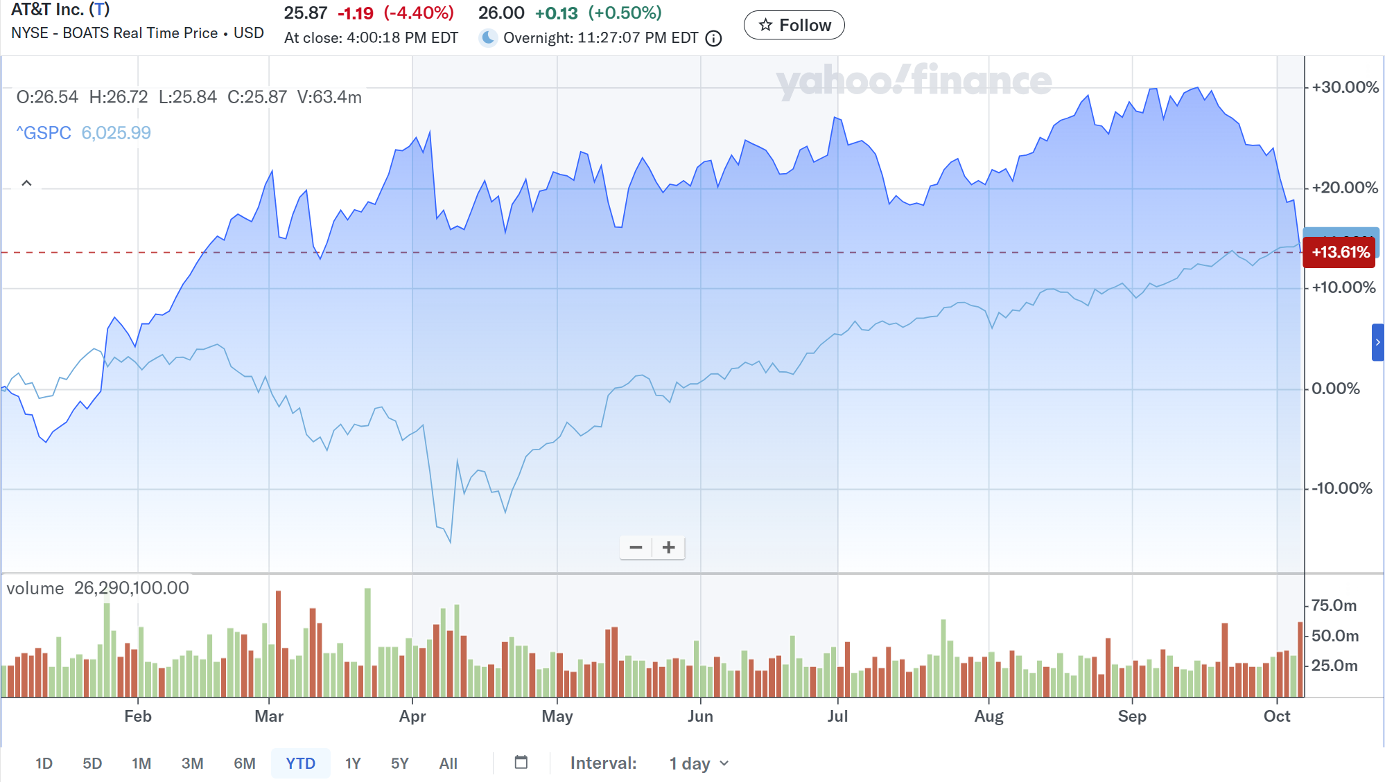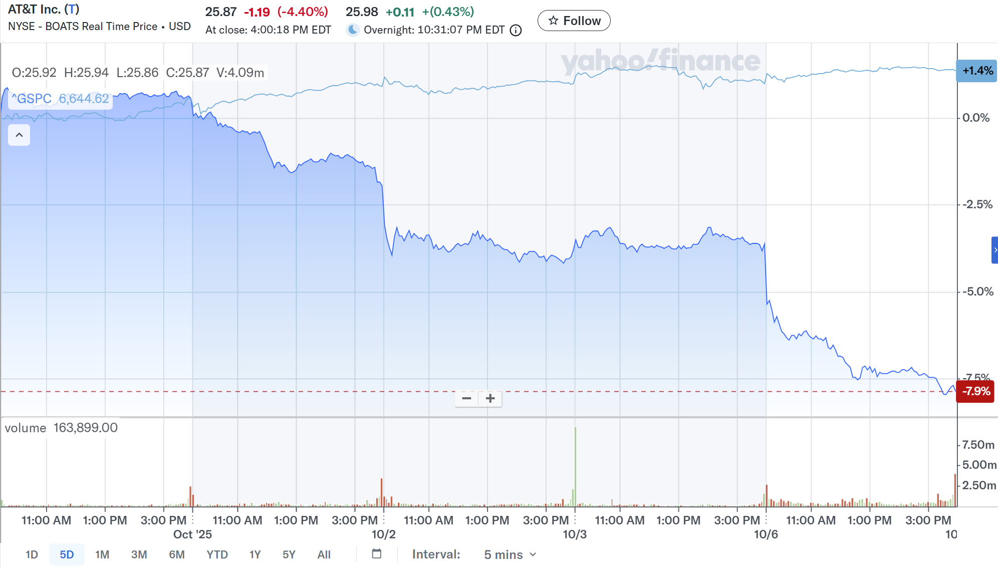 S&P 500が米2026会計年度つなぎ予算が不成立で10月1日から政府機関の一部閉鎖が続いている中で持ちこたえているのに対して、AT&T株は10月1日のBarclaysの投資格付け下方修正を受けて、10月1、2日と下落。10月3日はその格下げが株価に織り込まれたのかほぼ横ばいだったが、週が明けた10月6日に今回のScotiabankの投資格付け下方修正を受けて更に下落幅が拡大し、4営業日で約8%の下落となっている。