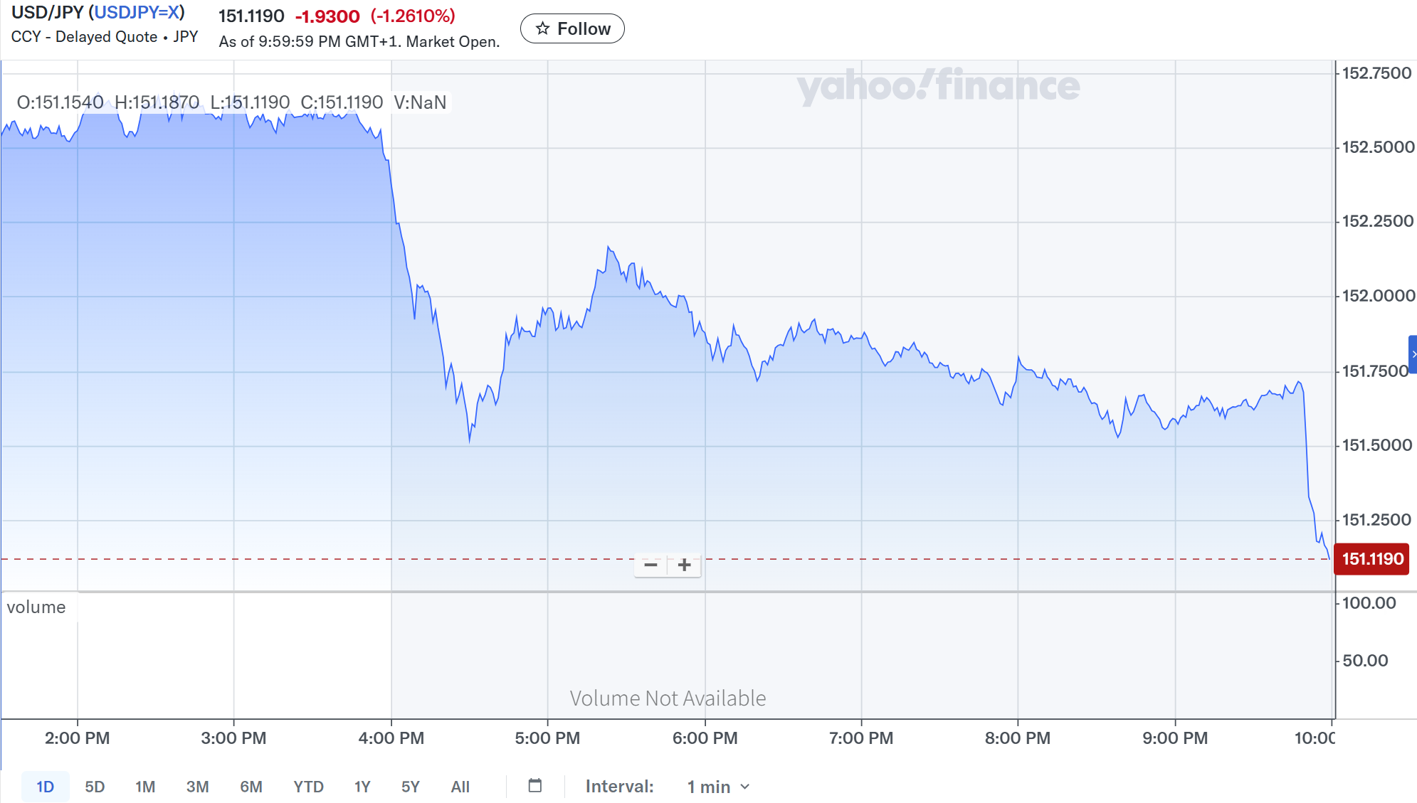 開場直後から前日比ややプラスでほとんど動きのない状態が続いていたが、トランプ大統領のSNS投稿があったタイミングで急激に下げ幅を拡大して取引を終えていることから、(この時点では)対中関税の大幅引き上げに関する懸念が下落原因だったことが判る。