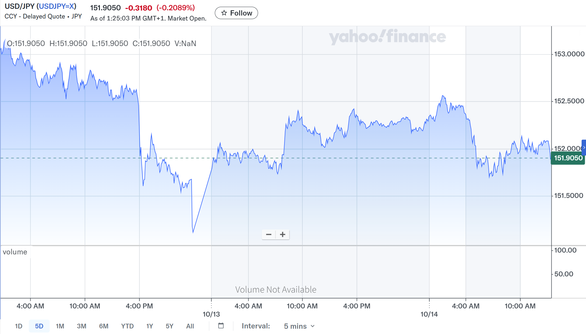 10月10日のトランプ大統領の1回目のSNS投稿(上記チャート16:00前)で1ドル=152円台後半から1ドル=151円台半ばまで、更に2件目のSNS投稿(上記チャート22:00前)で1ドル=151円台前半までドル安が進んで週の取引を終えている。
