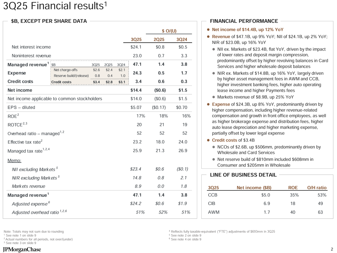 - 第3四半期は好調な業績となり、純利益は144億ドル、EPSは5.07ドル、ROTCEは20%を達成