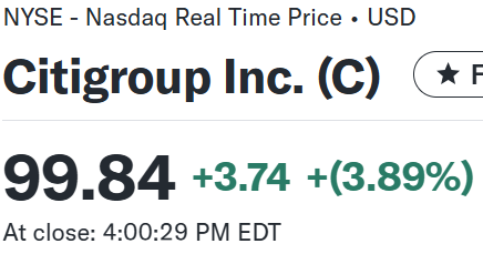 と書いていたのだが、その後懸念していた米相互関税上乗せ分が想定していたよりも概ね低い税率となり、市場全体が概ね堅調に推移する中、シティ株も好調に推移して一時100ドルを超えていた。