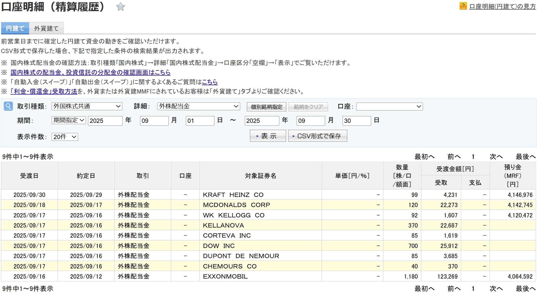 既に発表されていたダウ・インクの配当半減は予想していた通り、前回2025年6月の受取時の50,918円から25,912円と約2.5万円減。年間(4回)では約10万円減ということになり、改めて考えても影響は大きい。