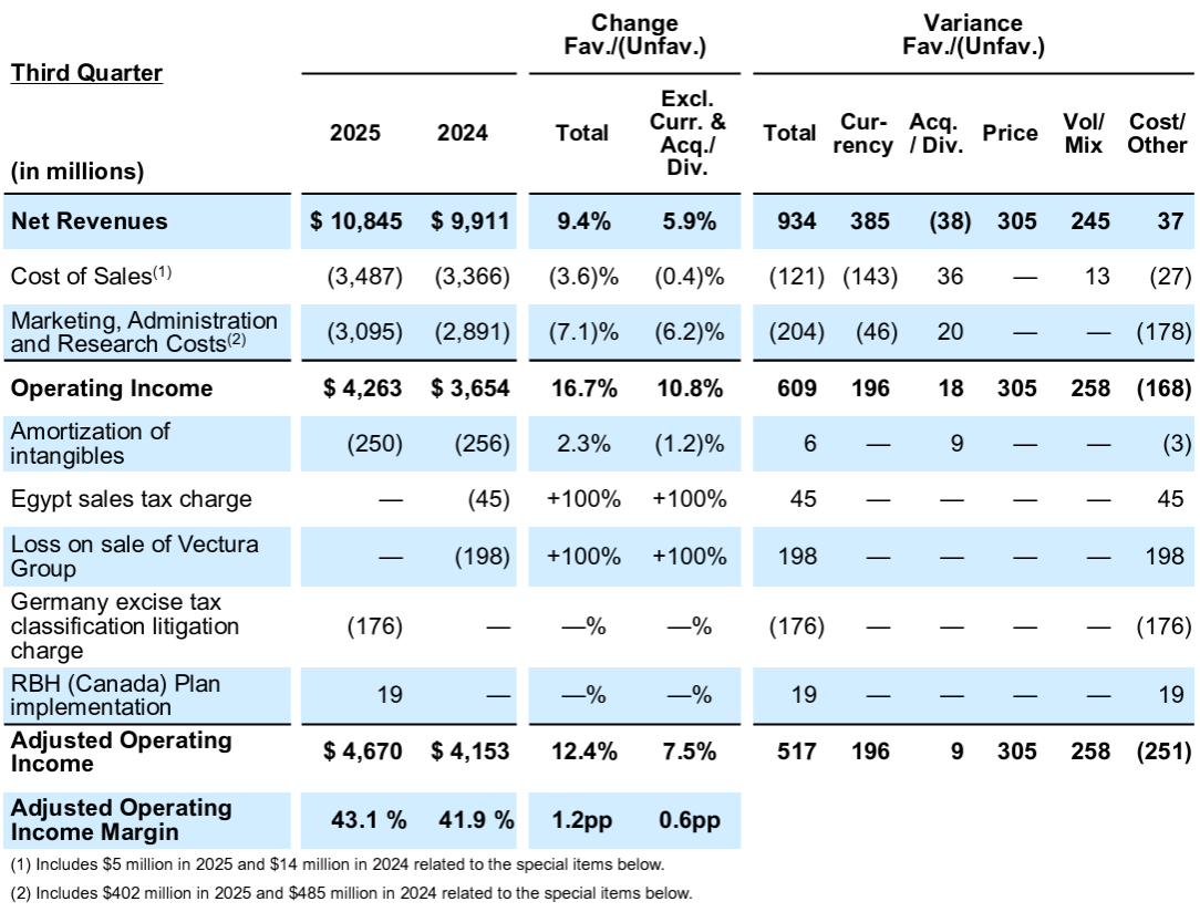 - 2025年第3四半期の純売上(Net Revenues)は108億4500万ドルで、為替や買収を除いて前年同期比5.9%増加