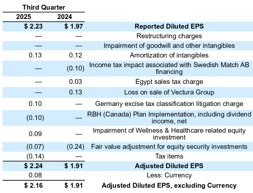 - 2025年第3四半期の調整後希薄化1株あたり純利益(Adjusted Diluted EPS)は2.24ドルで前年同期比17.3%増加、為替の影響を除くと2.16ドルで前年同期比13.1%増加