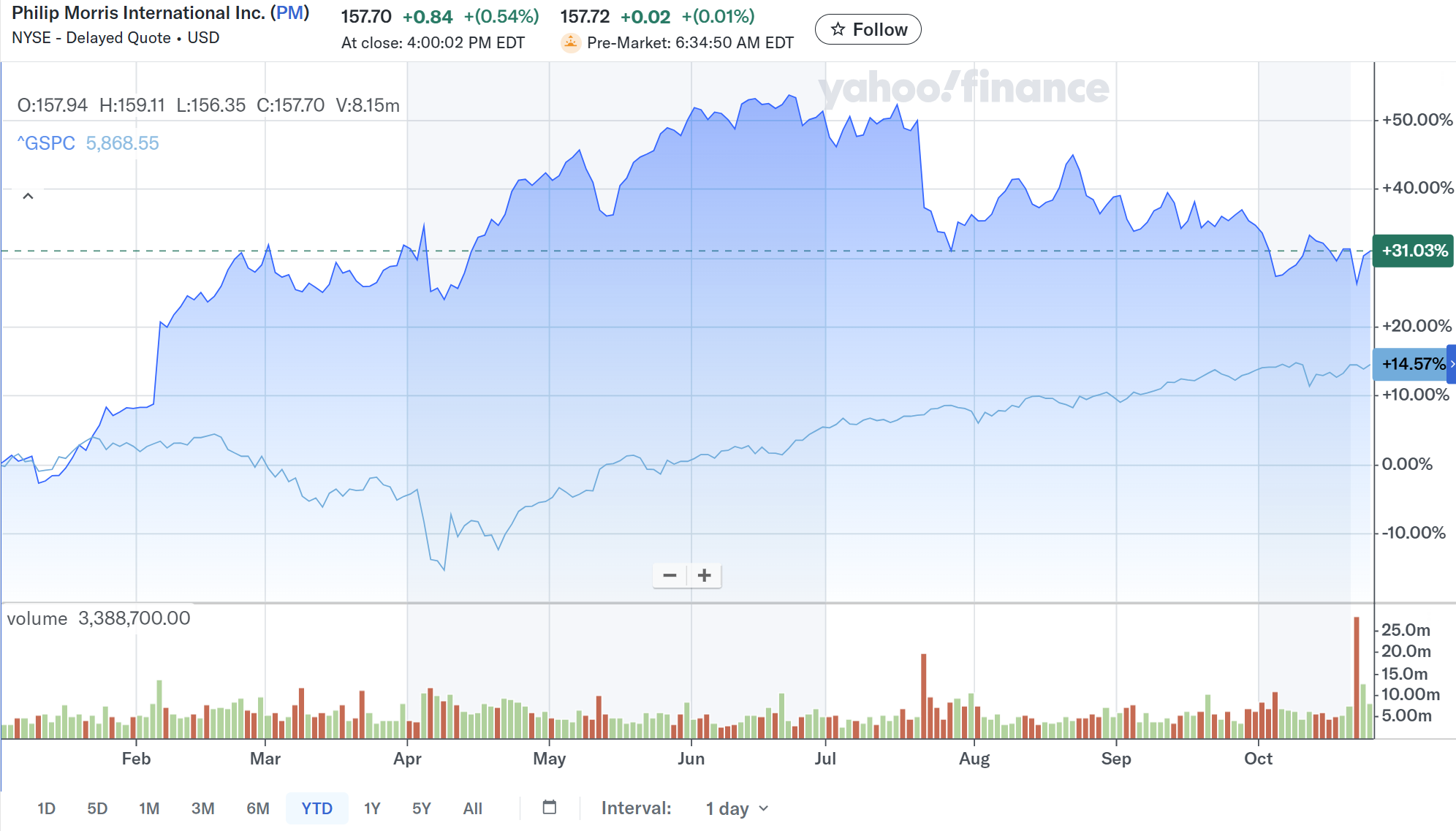 決算後数日を含めた年初来のフィリップ・モリス株の推移を市場(S&P 500)と比較すると