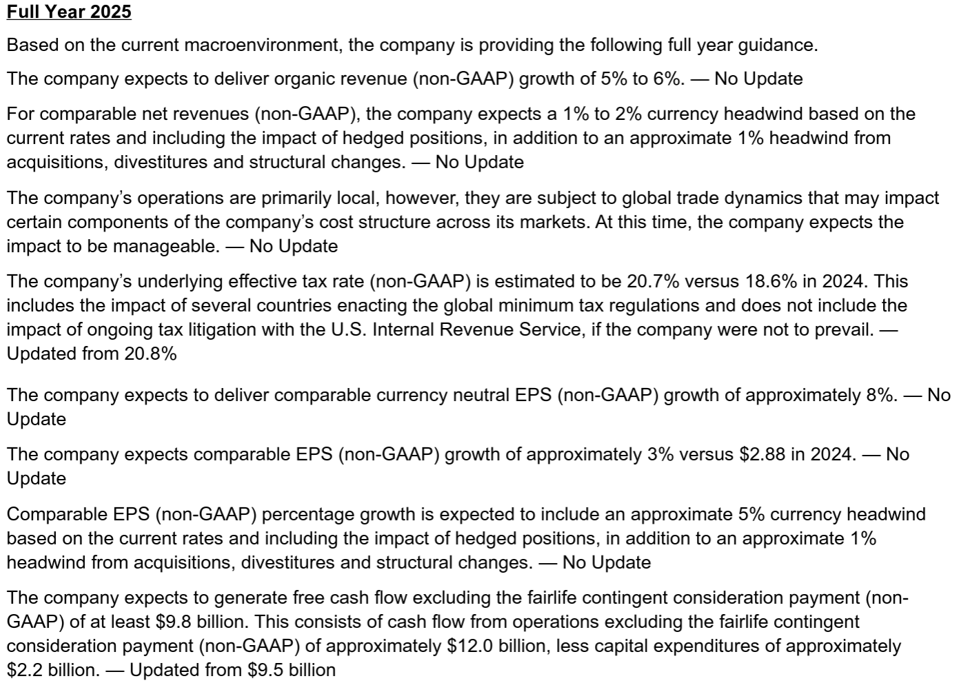 - Comparable EPS(為替を含む調整後EPS)成長率:3%(2024年は2.88ドル)(前回の2~3%から修正)