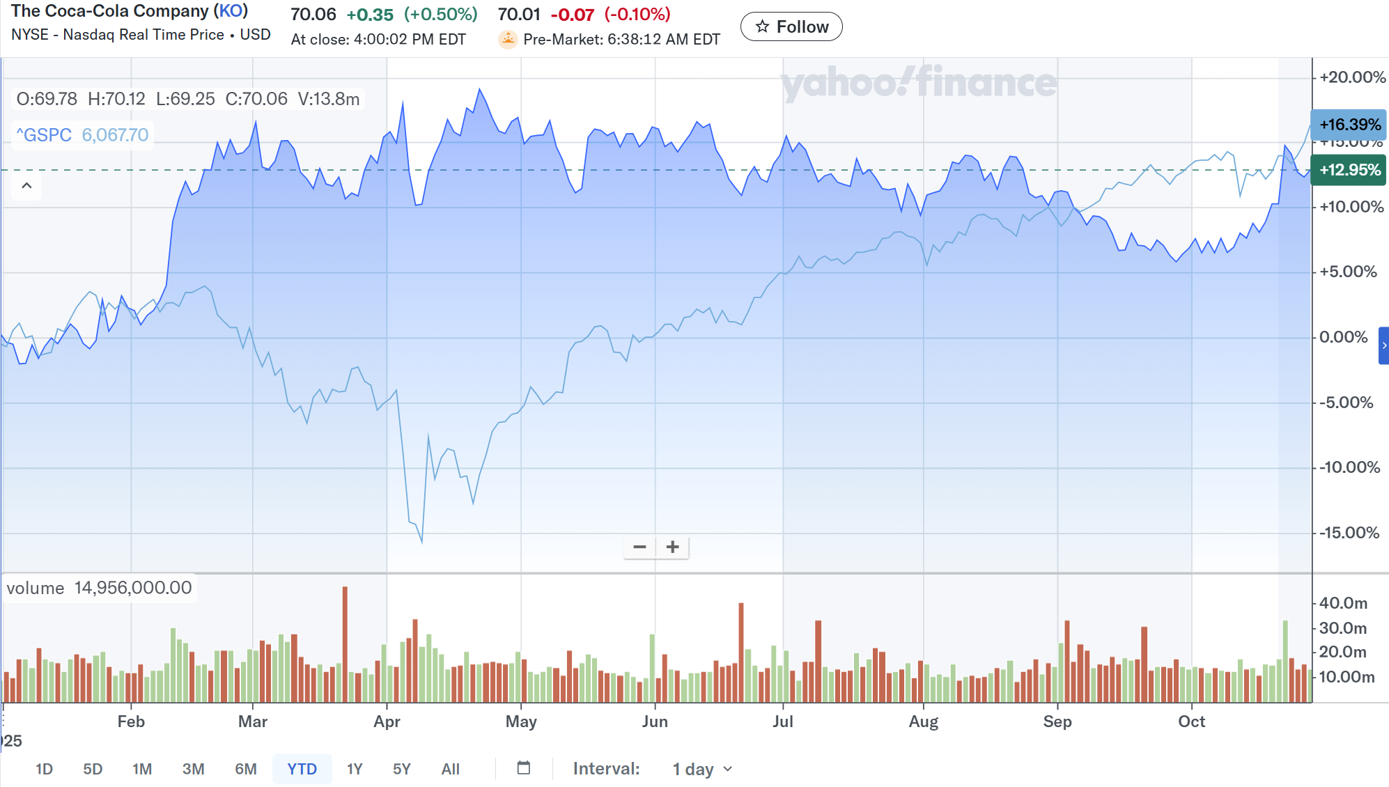決算後数日を含めた年初来のコカ・コーラ株の推移を市場(S&P 500)と比べてみると