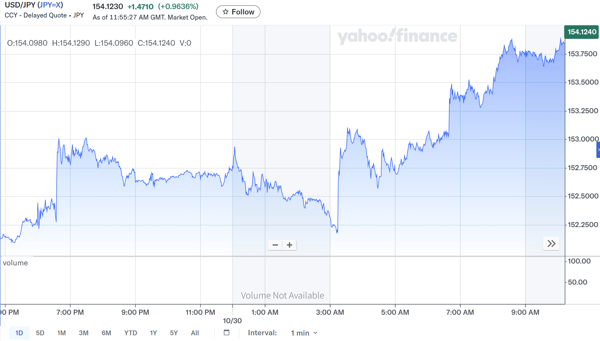 FOMC声明発表前は1ドル=152.25円前後で推移していたが、FOMC声明でやや上昇。そしてパウエル議長の会見を受けて一時1ドル=153円台に。その後緩やかにドル安となりFOMC前の水準へと戻ったが、日銀が30日の金融政策決定会合で、政策金利を0.5%程度に据え置くことを7対2の賛成多数で決定したことでドル高へ。その後もドル高の流れが続き、これを書いている時点では2025年2月半ば以来となる1ドル=154円台となっている。