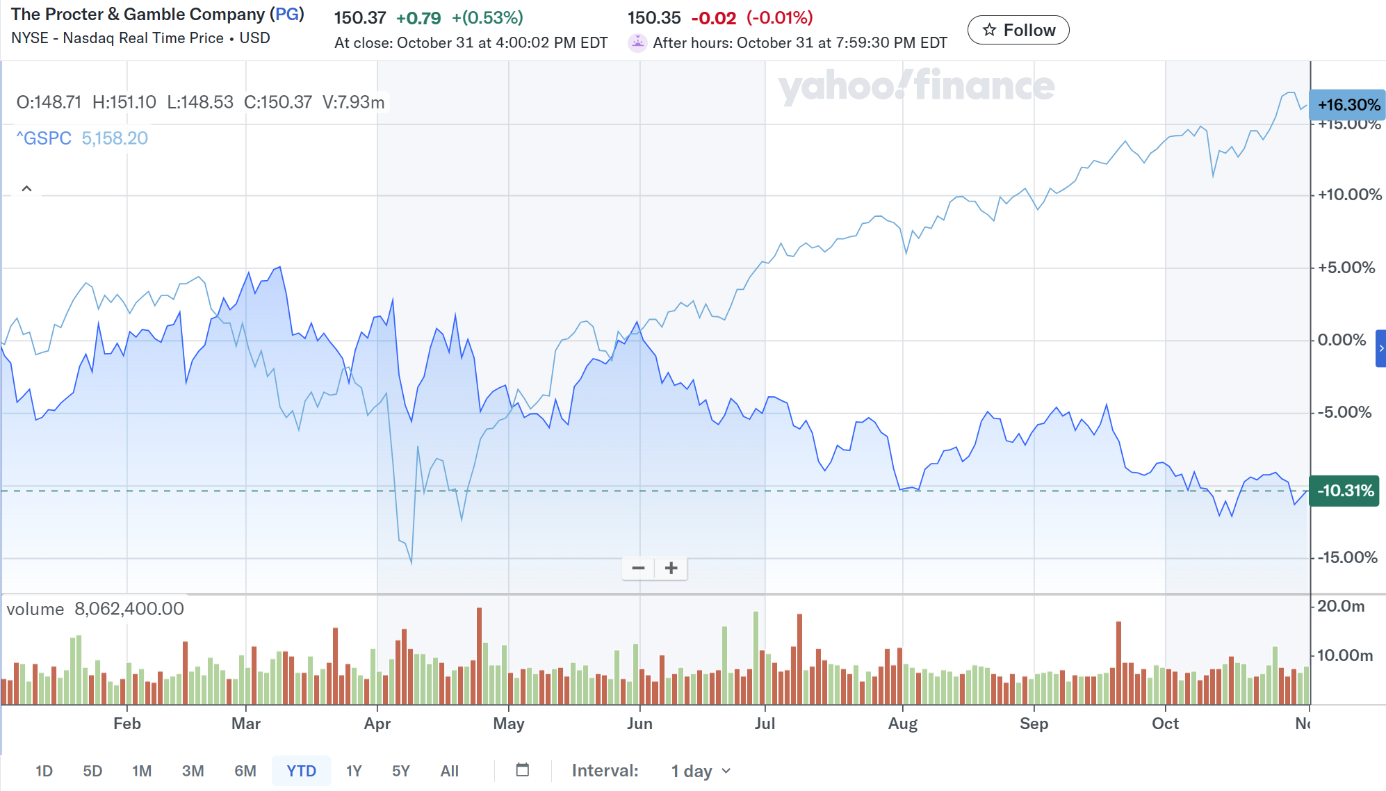 その後当時懸念していた米相互関税上乗せ分が想定していたよりも概ね低い税率となり、市場全体は色々ありながらも概ね堅調に推移する中で、P&G株はやはりあまり好調ではなかった印象がある。