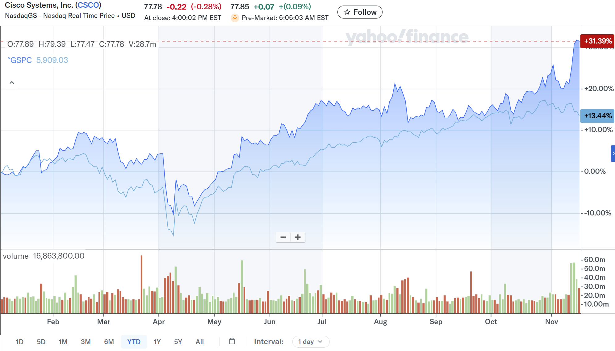 と米2026会計年度のつなぎ予算が成立したものの、10月分の雇用統計や消費者物価指数(CPI)が提供されない見込みで、12月のFRB政策金利決定への不透明感が高まったことから市場が大きく下落しているのと比べると、シスコ株の上昇はかなり大きい。