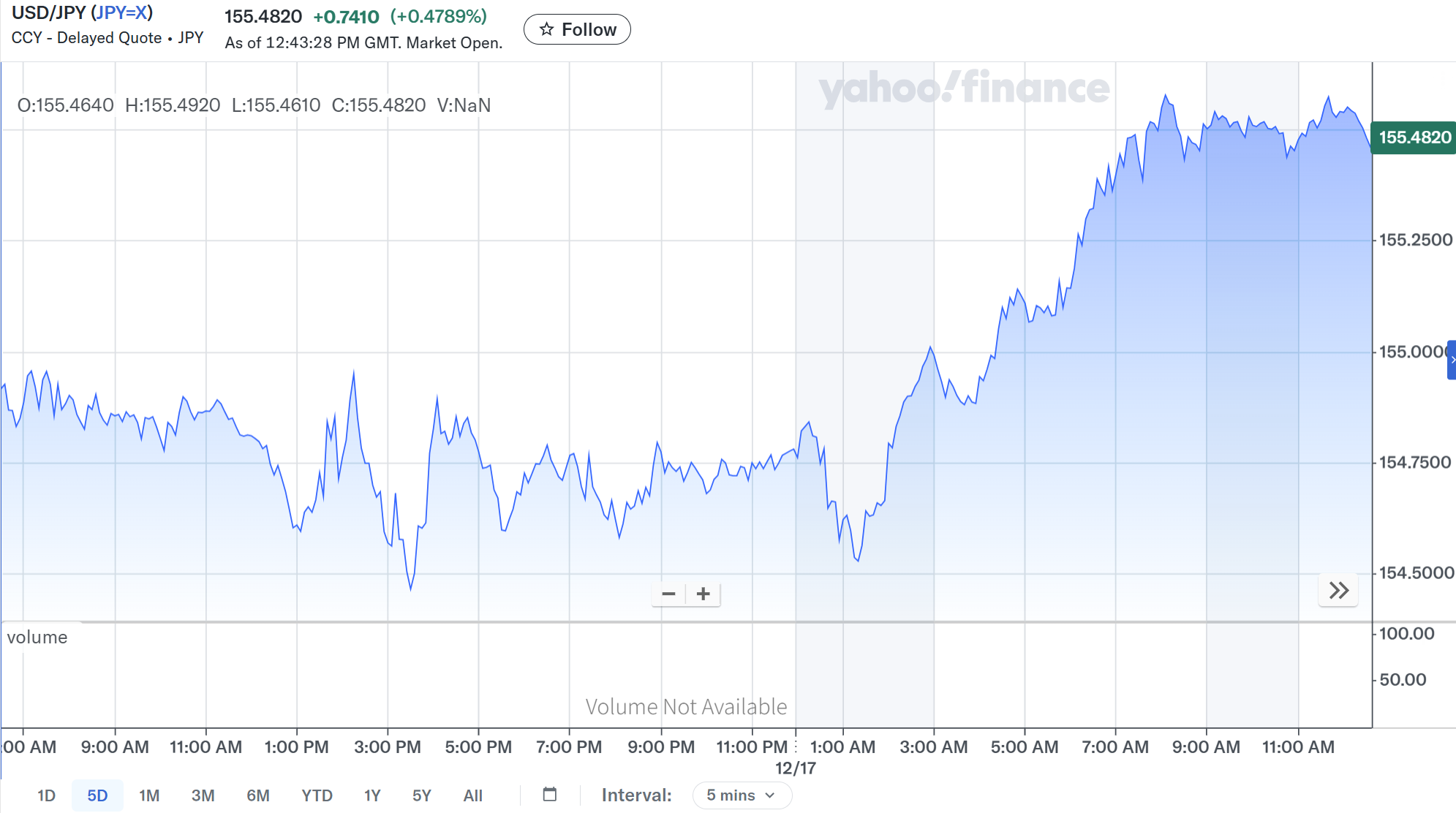 米雇用統計が発表されたタイミングや米国株式市場の開場時で少し変動はあったが概ね1ドル=154円台半ばから後半の狭いレンジでの動きで顕著な影響は見られずに米国株式市場の閉場を迎えている。