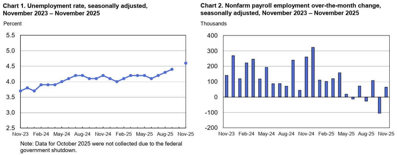 - 2025年11月の季節調整済み失業率は4.6%(前回9月はは4.4%)、市場予想は4.5%