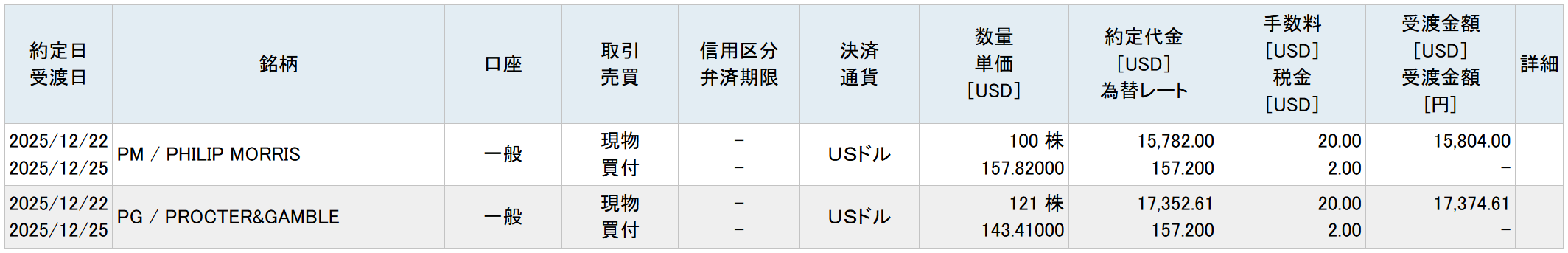 まず2025年12月22日(月)の米国株式市場開場前に、楽天証券のツールMarketSpeedから成行でフィリップ・モリス100株とP&G121株の注文を行った。