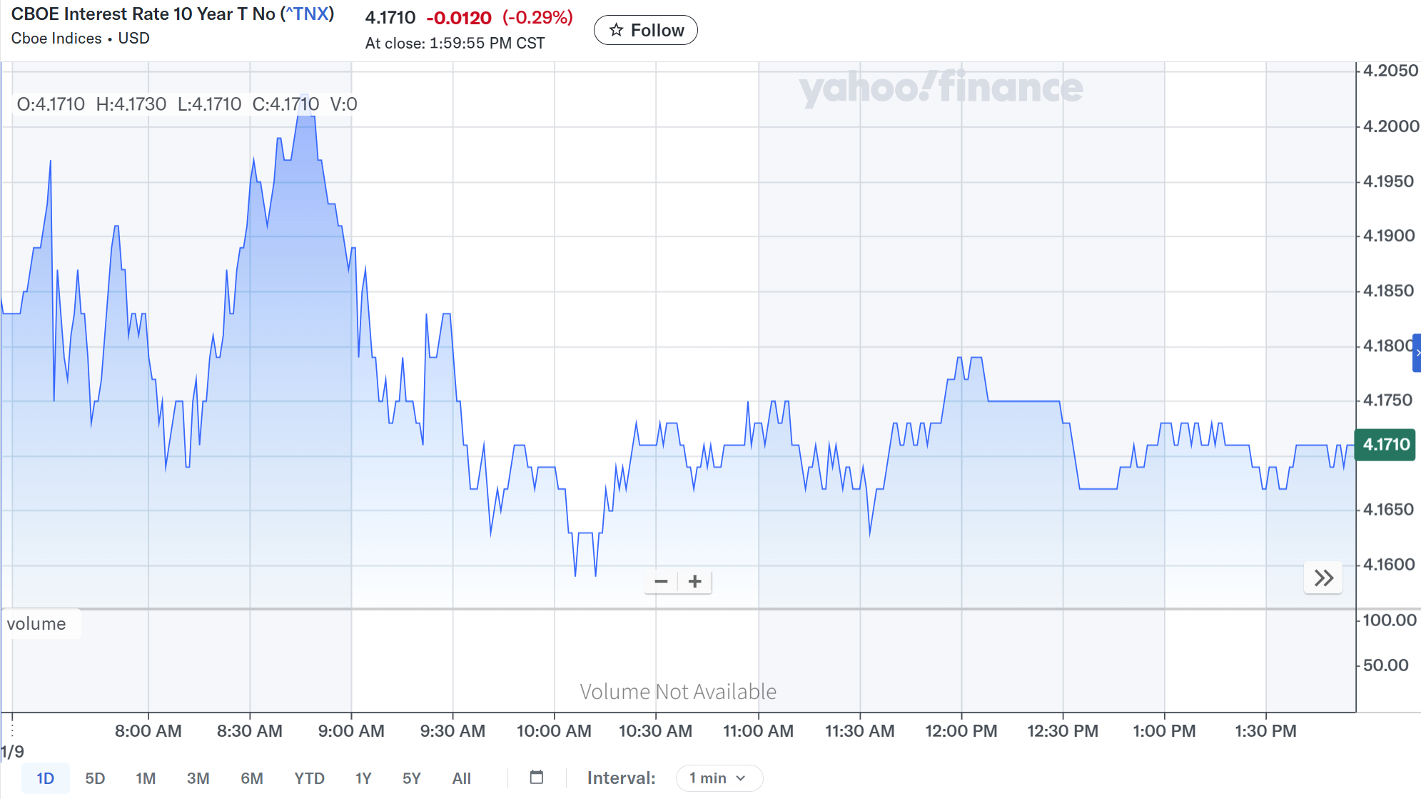 米雇用統計発表後は方向感が定まらない動きが続いていたが、上記チャートでは変動が大きい様に見受けられるが実際にはその範囲は極めて限定的。その後変動幅は更に縮小し、前日比やや利回りが低下した程度で取引が終了している。