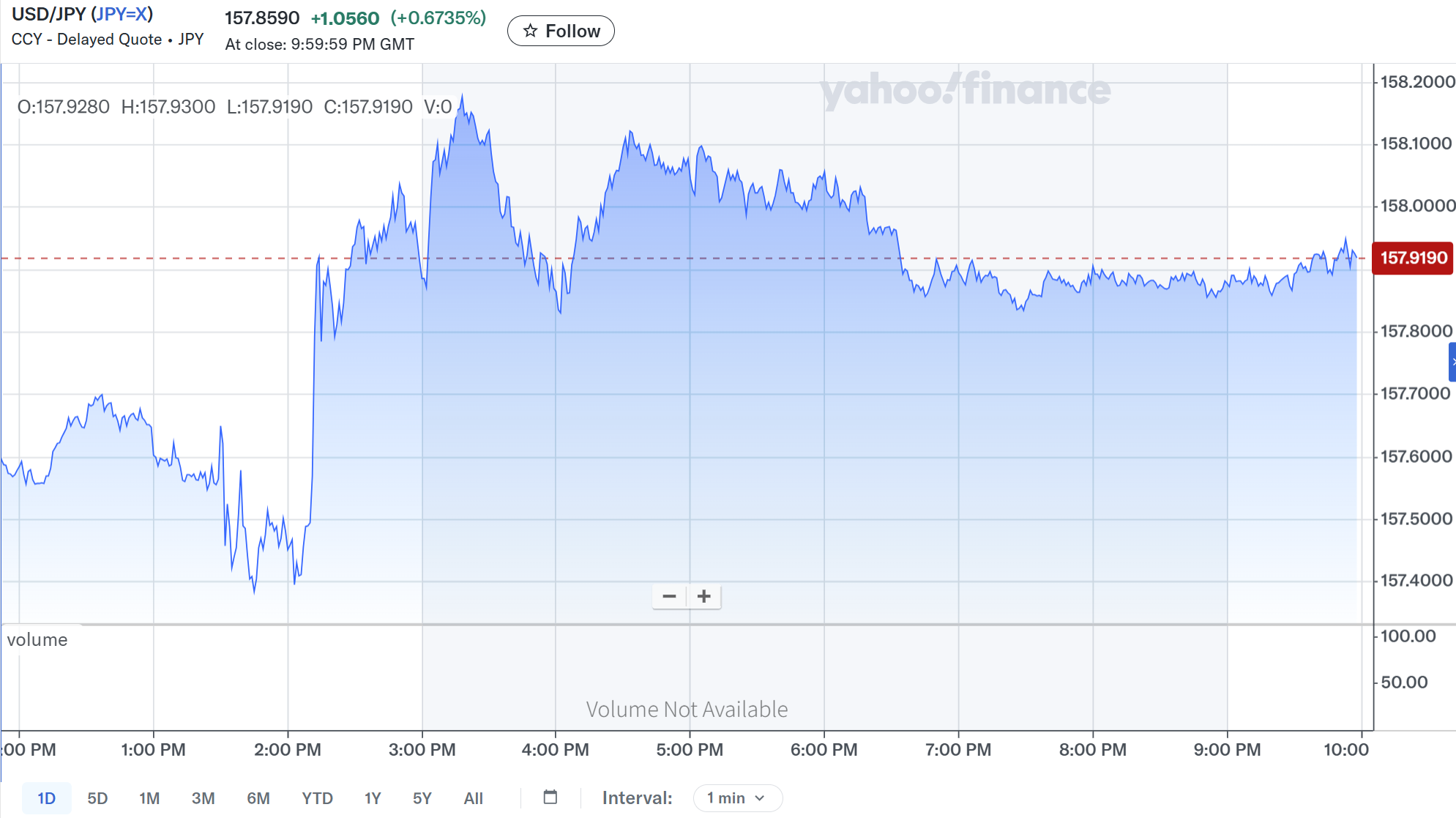 発表前は1ドル=157.6~7ドル辺りでの推移だったが、米雇用統計を受けてややドル安となり1ドル=157.5円を割り込む。しかしその後2:00PM過ぎにドル高が進み1ドル=158円を超えた。その後はややドル安となったものの1ドル=157.9円近辺での推移で週の取引を終えている。