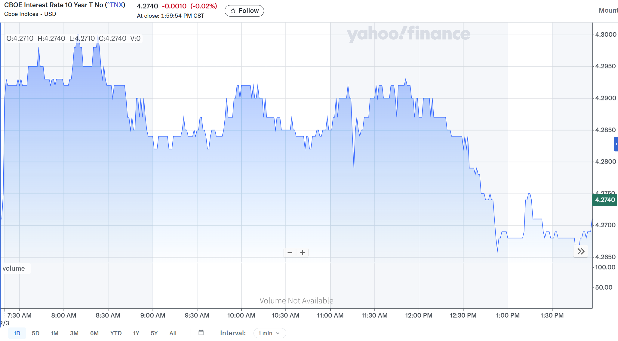 取引開始直後は利回りが上昇(債権売り進む)して始まったが現地時間12時過ぎ(東部標準時13時)ぐらいからは利回りが低下し、そのまま取引を終えている。