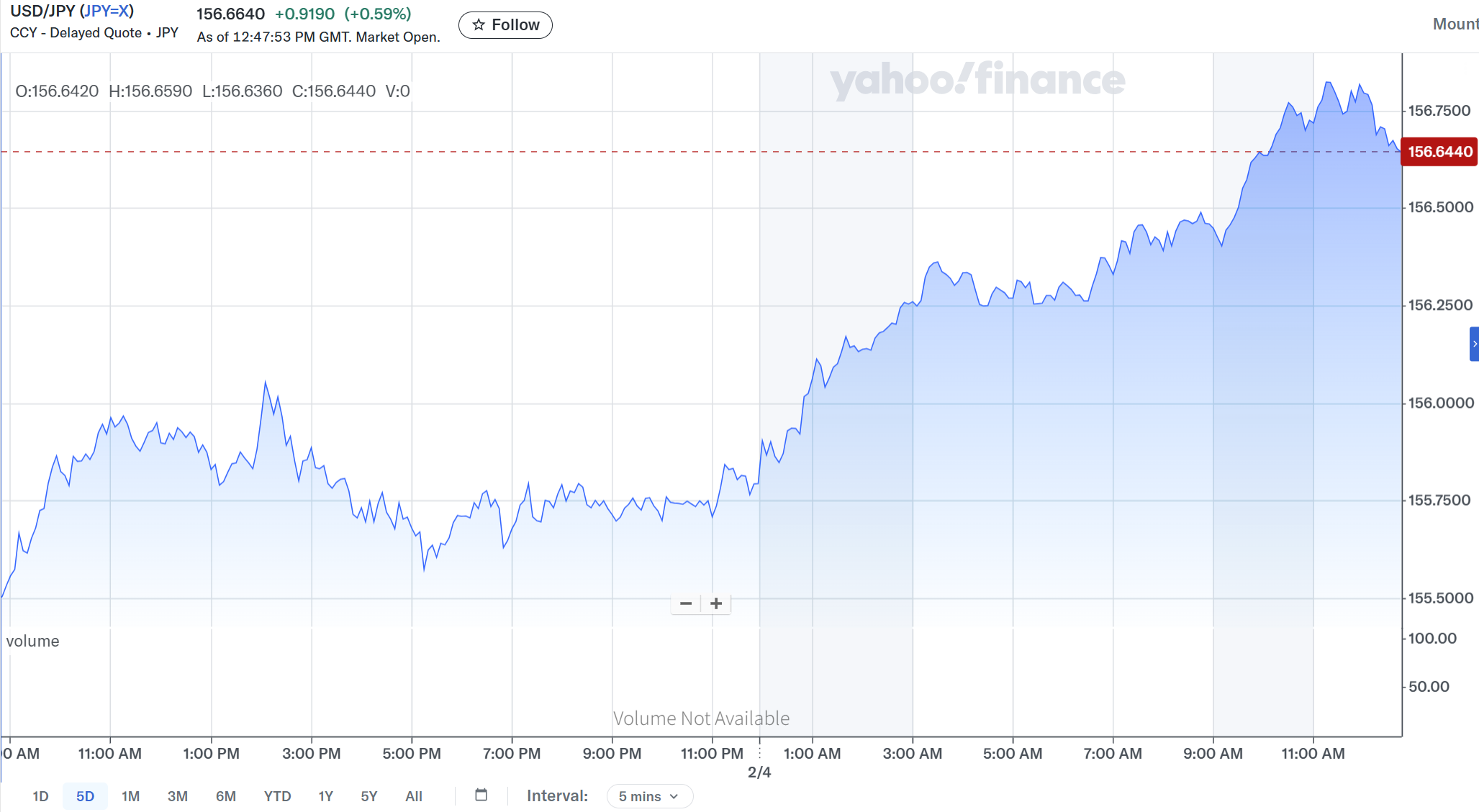 そして日本市場が始まる(上記GMTチャートでは2月4日0:00時)とともにドル高となり1ドル=156.5円を超え、2月4日の米国市場開場前時点では1ドル=156円台後半での推移が続いている。