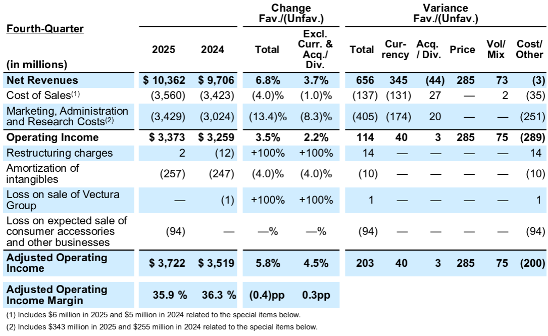 - 2025年第4四半期の純売上(Net Revenues)は103億6200万ドルで、為替や買収を除いて前年同期比3.7%増加
