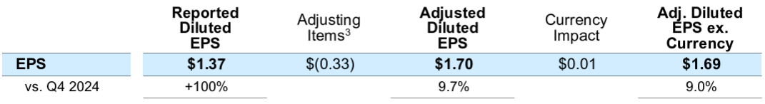- 2025年第4四半期の調整後希薄化1株あたり純利益(Adjusted Diluted EPS)は1.70ドルで前年同期比9.7%増加、為替の影響を除くと1.69ドルで前年同期比9.0%増加