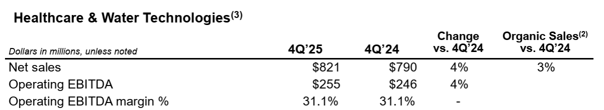 2025年11月のエレクトロニクス事業分離に伴い、今回から「Healthcare & Water Technologies」と「Diversified Industrials」という2つのセグメントで決算報告を行うよう変更されている。
