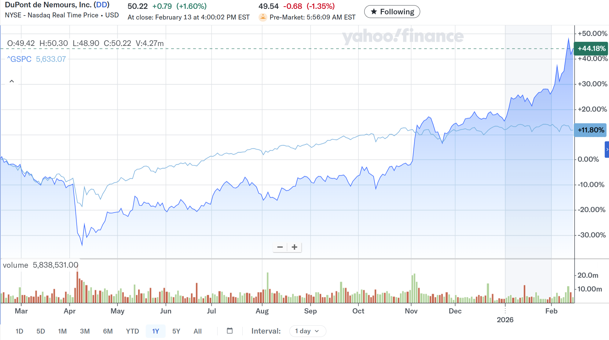 決算後数日を含めた過去1年のデュポン株の推移を市場(S&P 500)と比べると