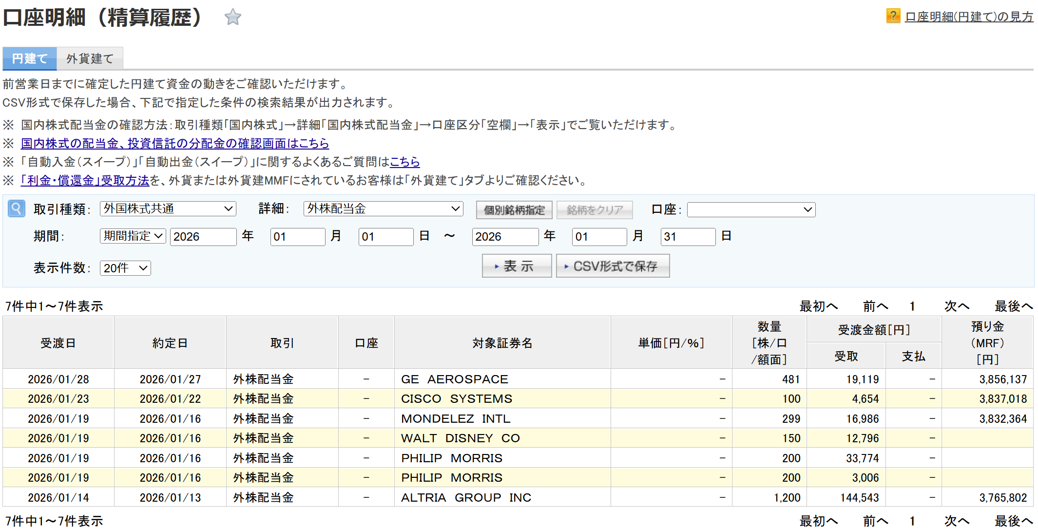 2026年1月の受取配当はディズニーが50%増となったものの、元々の所有株数が少ないので大勢に影響は無し。ただ2025年12月に購入した分のフィリップ・モリス株配当が早速反映されており、前回9月の約1.8万円から約3.6万円と倍増している。
