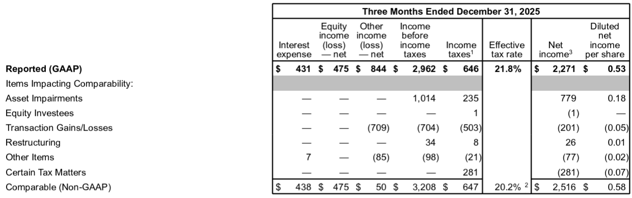 • 2025年第4四半期のNon-GAAPベースの比較可能な一時項目を除く1株当たり利益(Comparable Diluted Net Income Per Share)は0.58ドルで、市場予想の0.56ドルを上回っている
