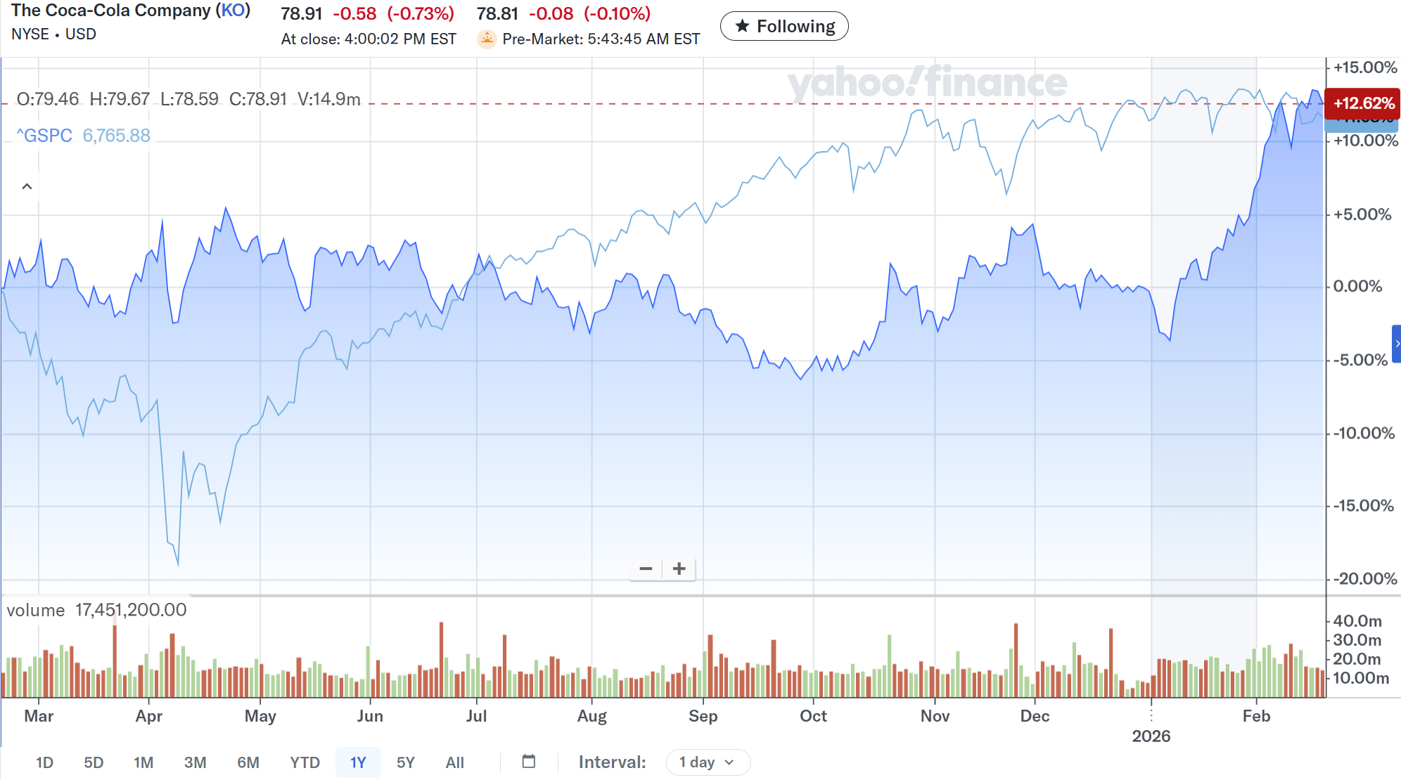 決算後数日を含めた過去1年のコカ・コーラ株の推移を市場(S&P 500)と比べると