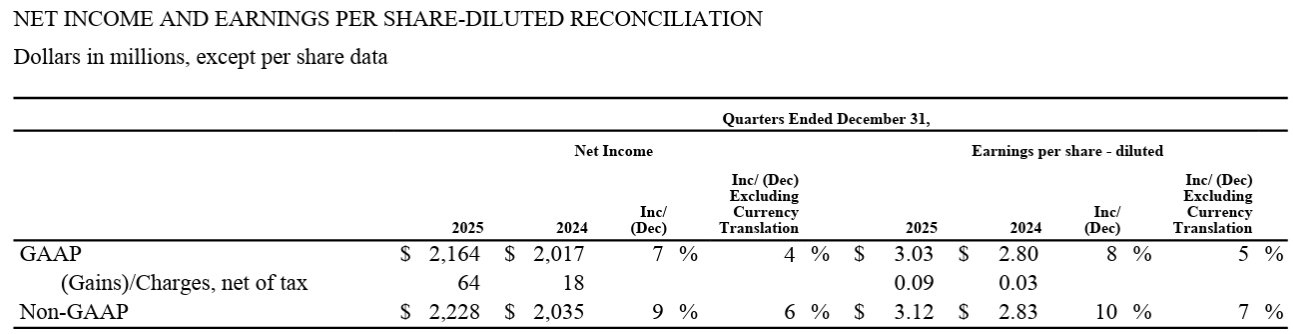 - 2025年第4四半期のGAAPベース希薄化後1株当たり利益(Earnings per share-Diluted)は3.03ドルで前年同期比8%増加(恒常為替ベースでは5%増加)。Non-GAAPベースでは3.12ドルで、前年同期比10%増加(恒常為替ベースでは7%増加)