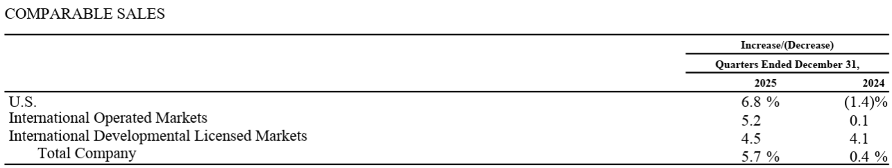 - 2025年第4四半期の世界全体の既存店売上高は5.7%増、市場予想の3.8%増を上回っている