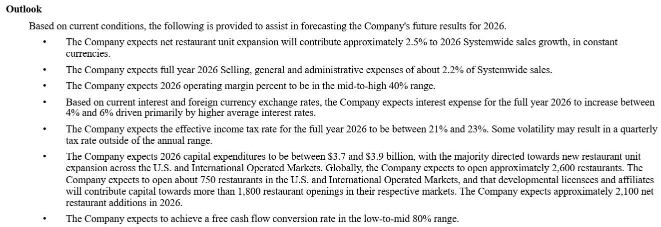 - 2026年の見通しの前提は慎重なものであり、米国および多くの市場におけるQSR業界の環境が依然として厳しいと予想していることを反映している