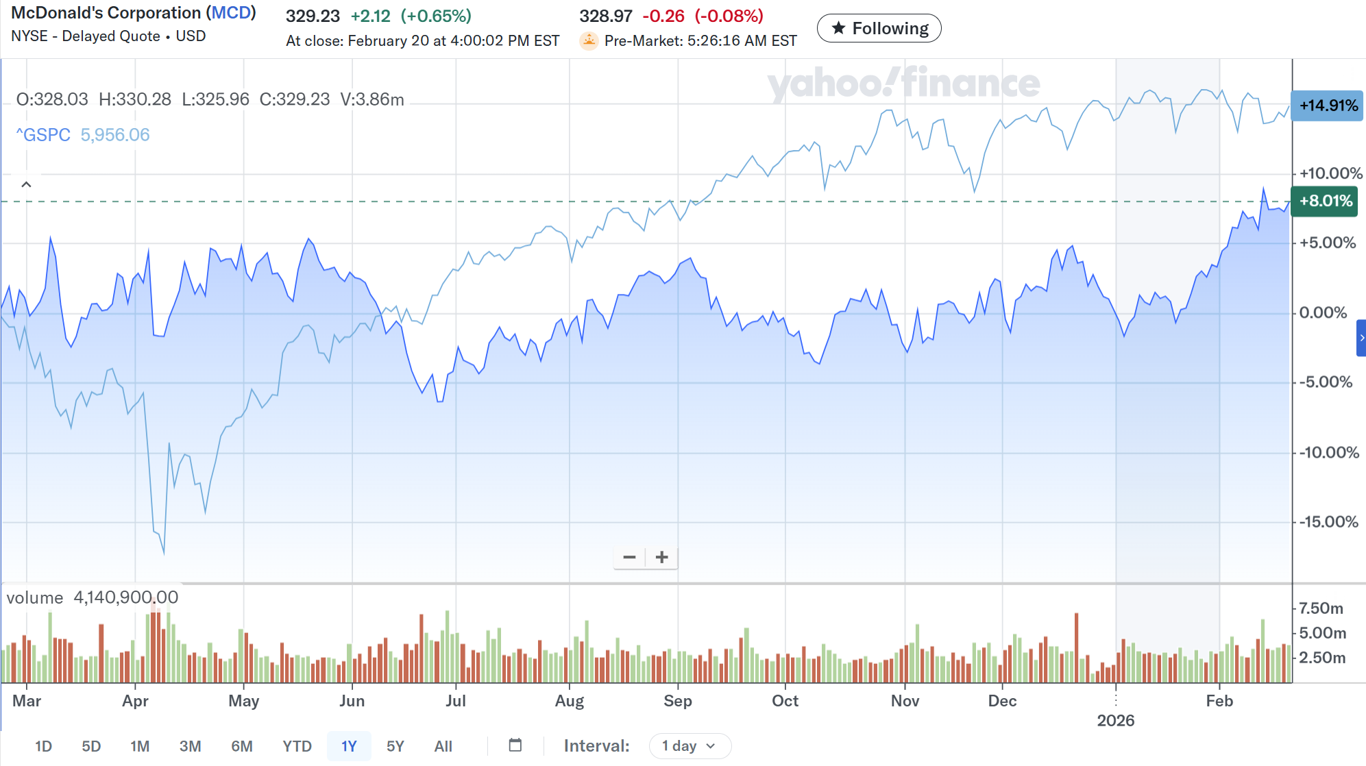 決算後数日を含めた過去1年のマクドナルド株の推移を市場(S&P 500)と比べると