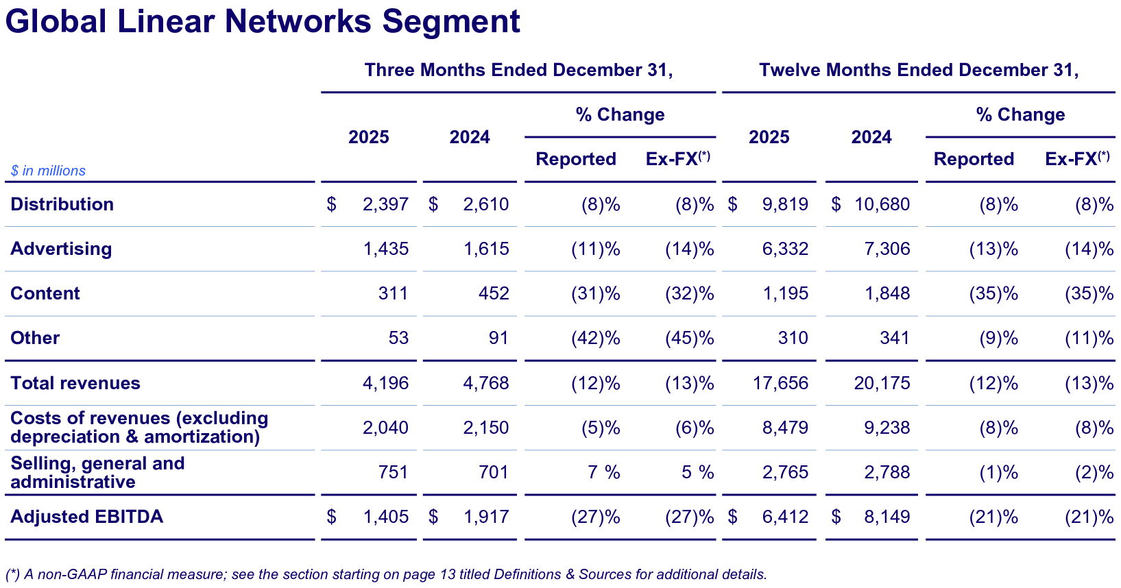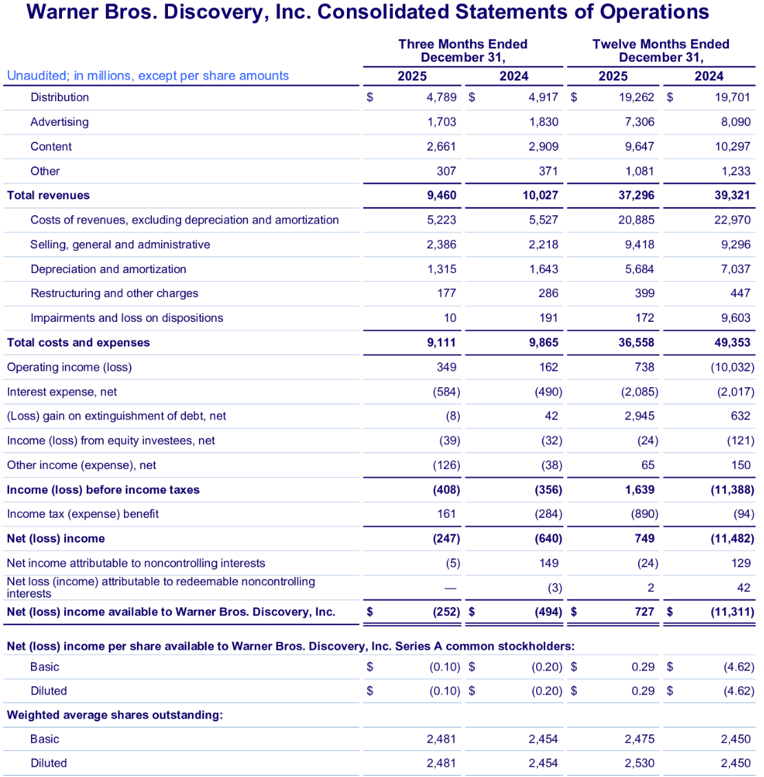 - 2025年第4四半期のシリーズA株希薄化後1株当たりの純利益(損失)(Net (loss) income per share allocated to Warner Bros. Discovery, Inc. Series A common stockholders Diluted)は0.10ドルの損失、前年同期は0.20ドルの損失