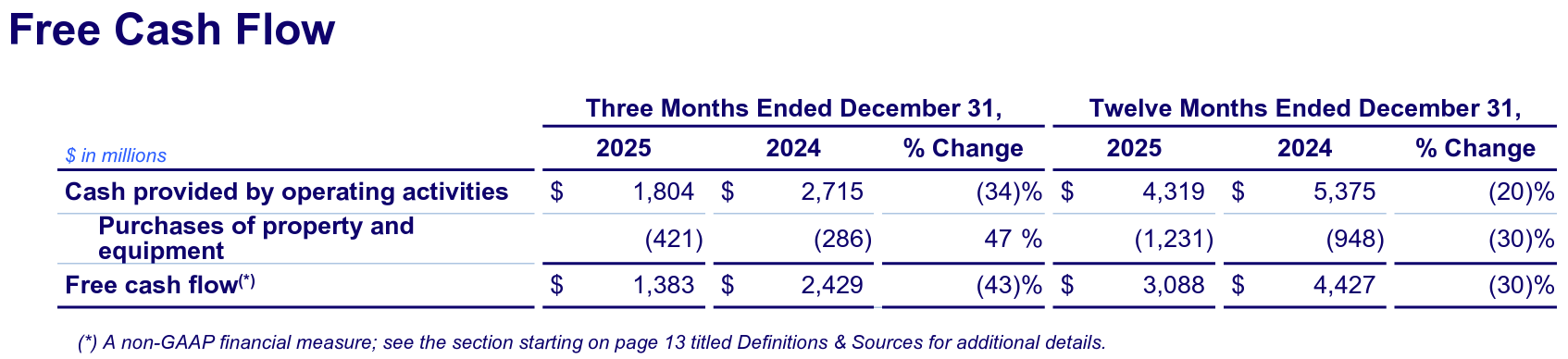 - 2025年第4四半期のフリーキャッシュフローは13億8300万ドル、前年同期は24億2900万ドルで前年同期比43%減少