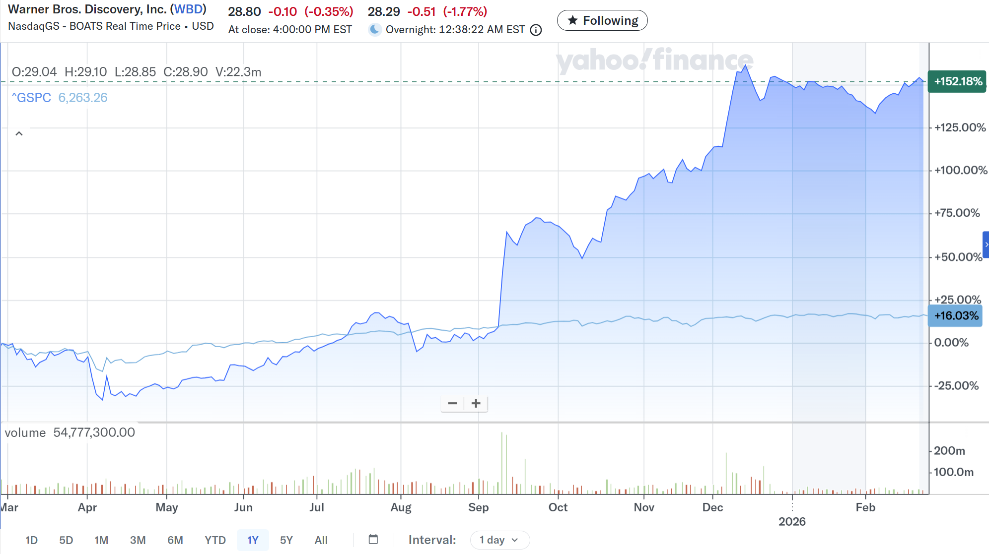 過去1年のワーナーブラザース・ディスカバリー株の推移を市場(S&P 500)と比べてみると
