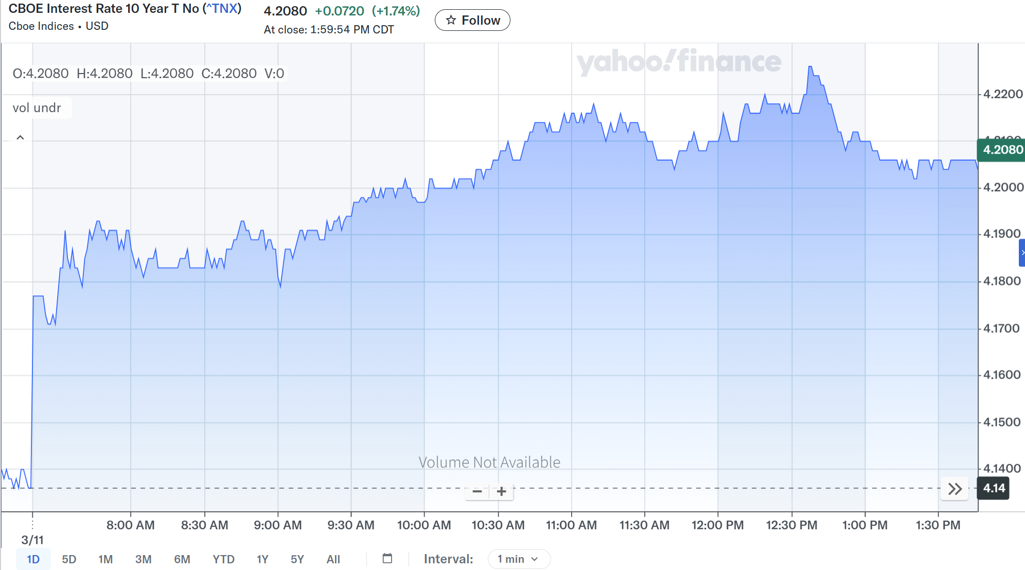 原油高によるインフレ高まりの懸念から利回りは前日比上昇して取引を開始。その後発表されたCPIは市場予想通りだったこともあってか、それとも2月のデータは古すぎるためか、ほとんど反応せず。その後も徐々に利回りは上昇して取引を終えている。