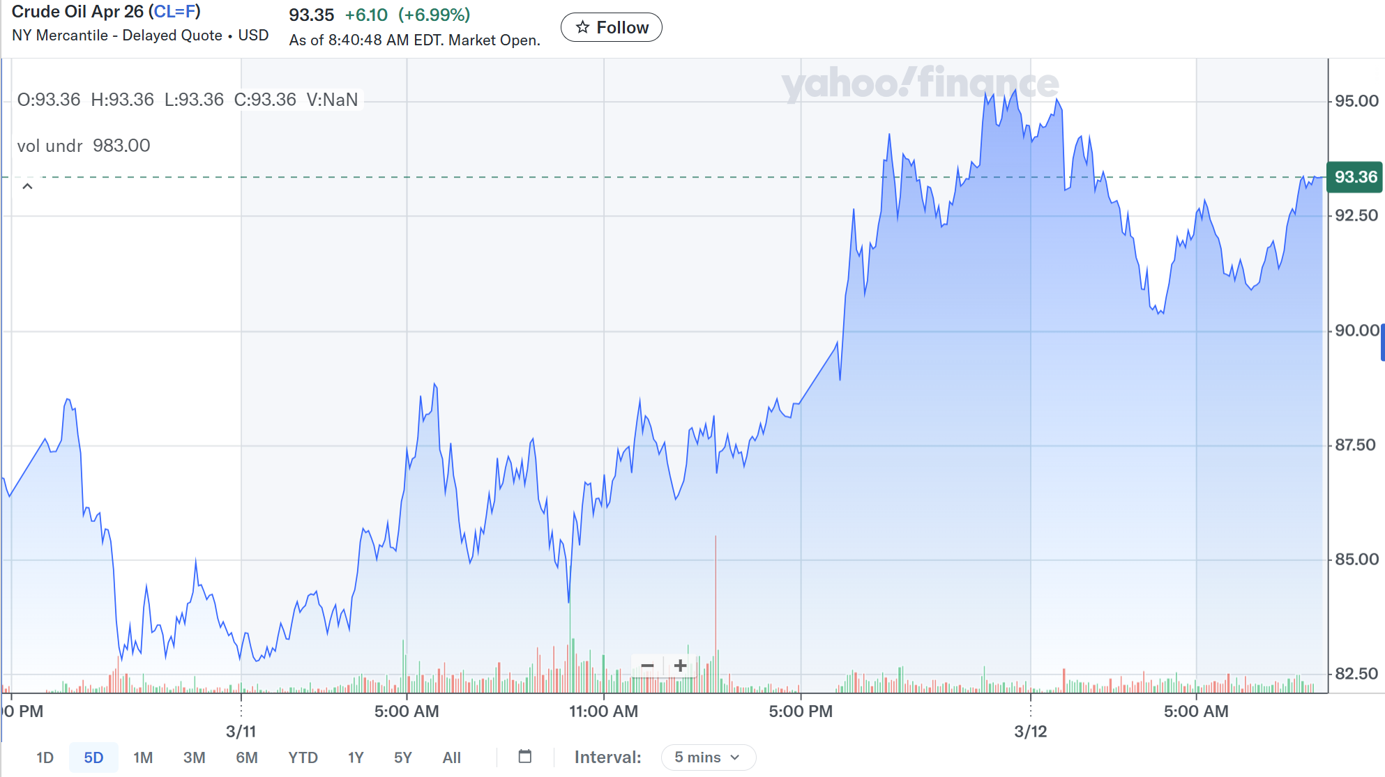 そして翌日の取引開始から一気に上昇し、1バレル=95ドルまで上昇。これはIEAによる戦略石油備蓄放出が十分ではないとの見方と、イランによる新たな攻撃でタンカーやエネルギー貯蔵施設が被害を受けたとの報が伝わり、事態の長期化への懸念がぬぐえないためだろう。その後は情報/思惑が錯綜しているのか1バレル=90~95ドルでの方向感が定まらない荒い動きとなっている。