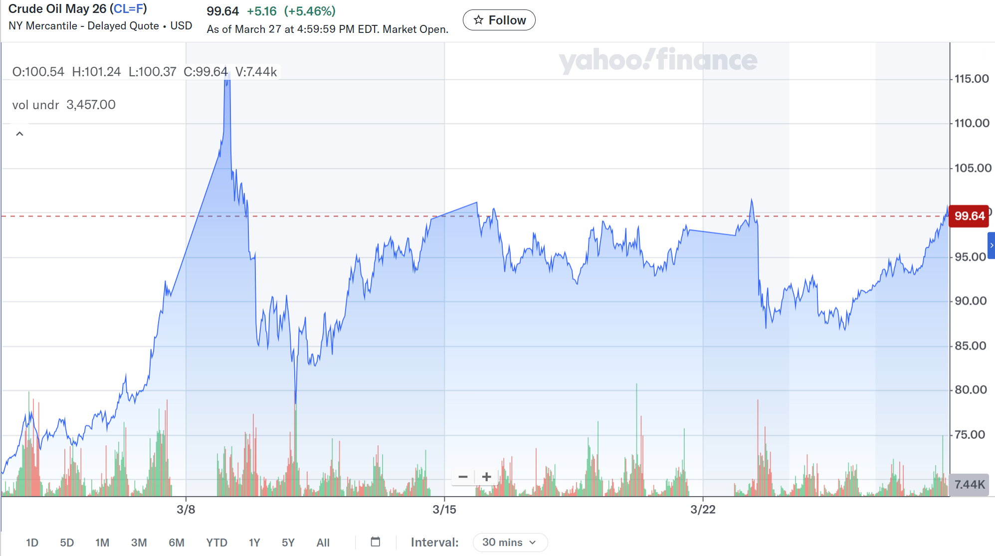 第4週のニューヨーク原油先物価格は、週明け早々にトランプ米大統領がイランのエネルギーインフラへの攻撃延期(5日間)を表明したことを受けて1バレル=100ドル近辺から90ドル近辺まで下落したものの、その後事態にめぼしい進展は見られなかった(トランプ大統領は更に10日間の攻撃延期を表明した)こともあり、週明けの水準とほぼ同じ1バレル=100ドル近辺で週の取引を終えている。
