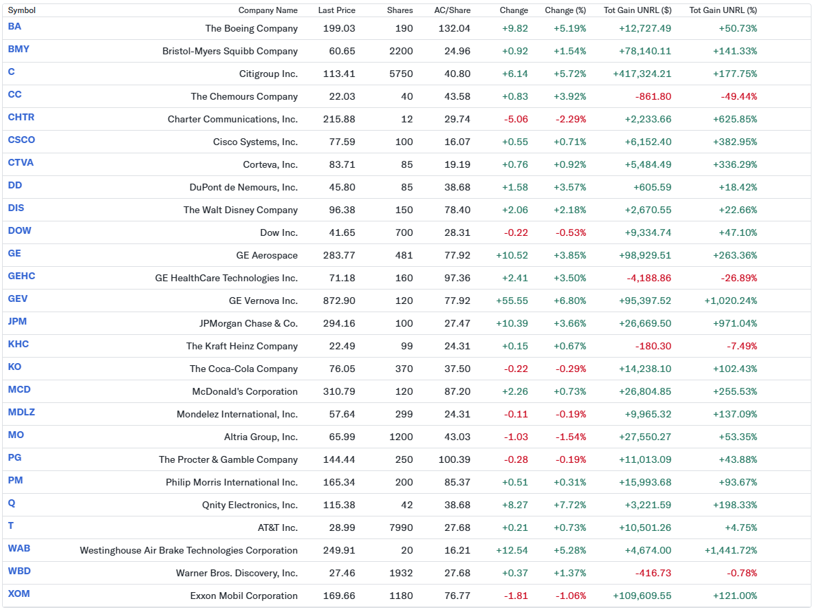 自分の所有26銘柄中では上昇が6銘柄、下落が20銘柄と下落が大勢を占めたのだが、ポートフォリオに占める割合の上位3銘柄シティグループ(C)、AT&T(T)、エクソン・モービル(XOM)がいずれも上昇(シティは2.9%、AT&Tは3.5%)したため、全体では1万ドル強、割合では0.55%の減少にとどまっている。