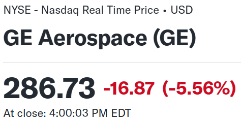 市場予想を大きく上回る売上高、EPSに加え、通期見通しも維持してレンジの上限見込みとしたのだが、フライト数の見通し下方修正やジェット燃料の高騰などがエンジンを供給しているGEエアロスペースへの懸念として、より強く材料視された(実際カンファレンスコールでもリスクがあることに言及していた)ことが大幅下落となったようだ。