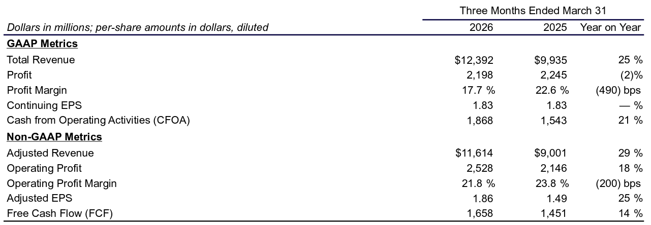 - 2026年第1四半期の調整後売上高(Adjusted Revenues)は116億1400万ドル、前年同期は90億100万ドルで前年同期比29%の増加