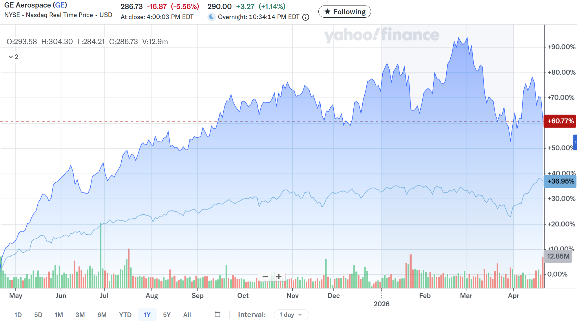 年初来のGEエアロスペース株の推移を市場(S&P 500)と比べると
