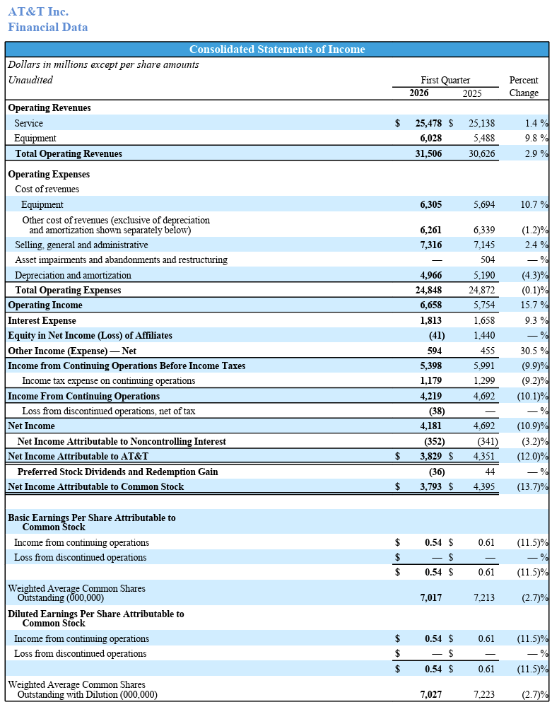 - 2026年第1四半期のAT&T帰属の純利益(Net Income Attributable to AT&T)は38億2900万ドル、前年同期は43億5100万ドルで前年同期比12.0%の減少