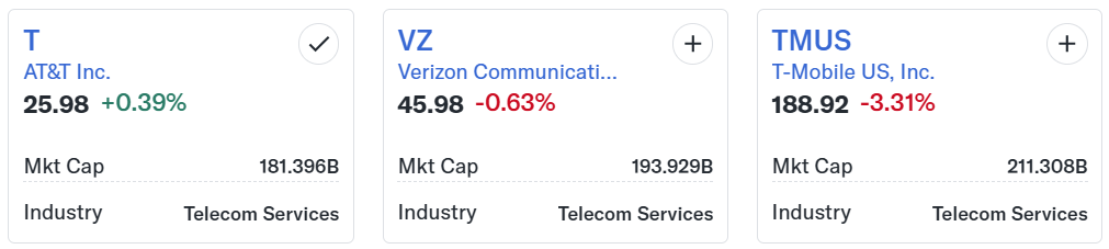 市場予想を上回る売上、EPS、Postpaid phone純増数だったにもかかわらず、序盤に下落した理由が不可解だったのだが、調べてみると同日ブルームバーグがドイツテレコムがTモバイルとの経営統合(既にドイツテレコムはTモバイルの約53%の株式を保有)を目指しているとの関係筋からの情報を報道したことが影響したようで、その後はAT&Tの堅調な決算が改めて評価されたことで最終的には上昇で終えたものと思われる。ちなみに同日の米大手通信業者の株価は以下の様になっている。