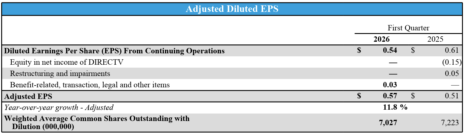 - 2026年第1四半期の調整後一株当たり利益(Adjusted EPS)は0.57ドル、前年同期は0.51ドルで前年同期比11.8%増加