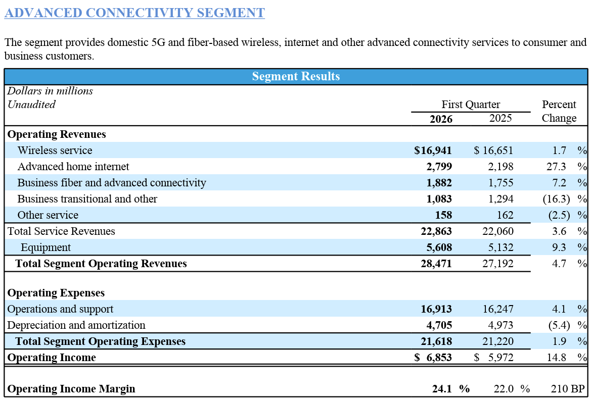- 移行およびレガシー収益の減少によって部分的に相殺されるものの、光ファイバーおよび固定無線インターネットの顧客数の増加、そしてインターネットと無線接続の両方でAT&Tを選択する顧客アカウントの増加によって当社の成長は牽引され、引き続き通期の連結サービス収益は1桁台前半の成長率で推移すると想定