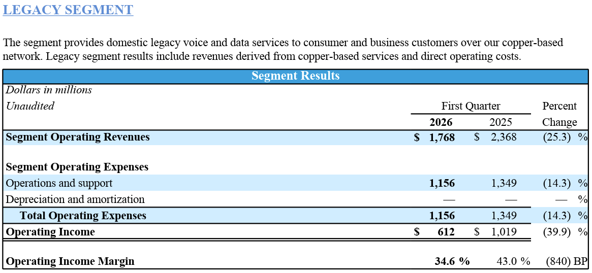 主に国内の5Gおよび光ファイバーベースのワイヤレス、インターネット、その他の高度な接続サービス。2025年の連結売上高の約90%を占めた - Legacy(レガシー):