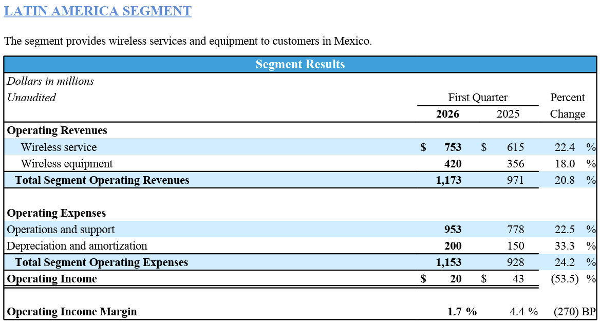 ラテンアメリカ事業はメキシコにおけるワイヤレスと機器サービスのみで事業規模が極めて小さいのため、以下の図表数値のみを参考として掲載。